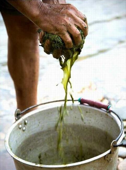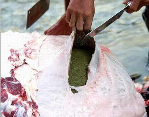 Những cọng cỏ trong dạ dày bò. Để chế biến món lẩu, người dân mổ những con bò khỏe mạnh, không nhiễm bệnh tật. Sau đó họ đun kỹ dịch lỏng từ thức ăn chưa tiêu hóa của bò.
