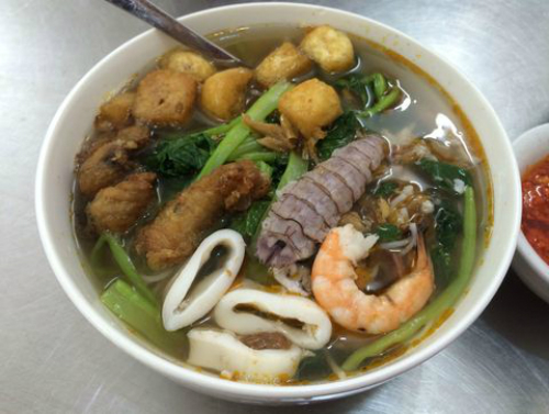 Giá của một bát bún hải sản ở đây chỉ 30.000 đồng, với đầy đủ các loại hải sản như tôm, bề bề, mực, cá cùng đậu phụ chiên và rau cải ngọt.