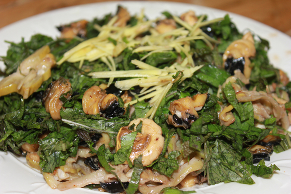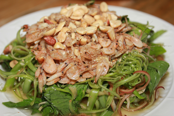 Tép sông con nhỏ, rửa sạch, để ráo, đem rang chín với một chút dầu ăn. Lạc khô rang chín, xát bỏ vỏ và đập dập, húng quế đem rửa sạch thái nhỏ, ít hoa chuối rửa sạch để ráo. Tỏi bóc vỏ, giã dập, ớt thái sợi, bỏ hạt. Cho tỏi, ớt, nước cốt chanh cùng ít đường, mì chính khuấy đều cho tan. Rau muống, hoa chuối trộn với tỏi ớt chua ngọt, sau đó cho hung quế và tép vào, kế tiếp là lạc rang lên trên. Dùng đũa trộn đều các hỗn hợp. Khi ăn bạn sẽ cảm nhận được đủ các vị chua, cay, mặn, ngọt và cả vị giòn giòn rất thú vị từ rau muống.