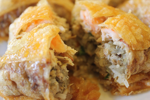Nhân nem gồm có thịt cua tươi, thịt nạc vai, tôm, nấm hương, trứng, giá… tẩm ướp gia vị vừa miệng. Một điều cũng rất quan trọng để nem có độ giòn, thơm, chính là loại bánh đa cuốn thường chỉ được đặt làm riêng. Bánh đa sau khi nhúng nước, để ráo, cho các nguyên liệu đã chuẩn bị vào, sau đó khéo léo gói thành hình vuông trông đẹp mắt. Khi ăn, người ta kèm với bún và rau sống, nước chấm có vị chua cay ngọt. Vị ngọt của thịt cua bể, giòn của vỏ bánh đa cuốn rán vừa chín tới, thêm chút đậm đà của mắm chấm… làm hài lòng ngay cả những người khó tính nhất.
